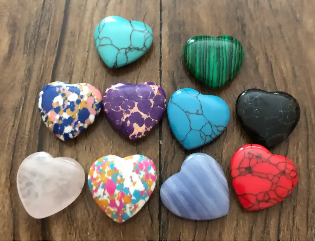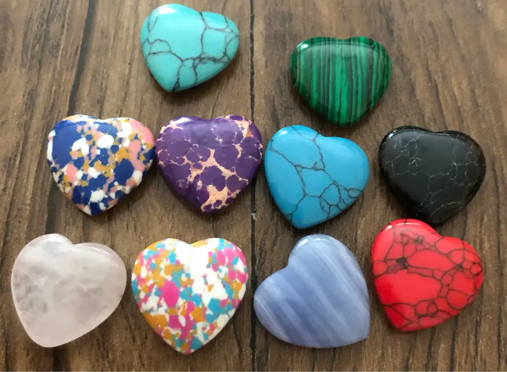 Authentic natural crystals and minerals, hand-carved into polished heart shapes (approx. 20mm each).